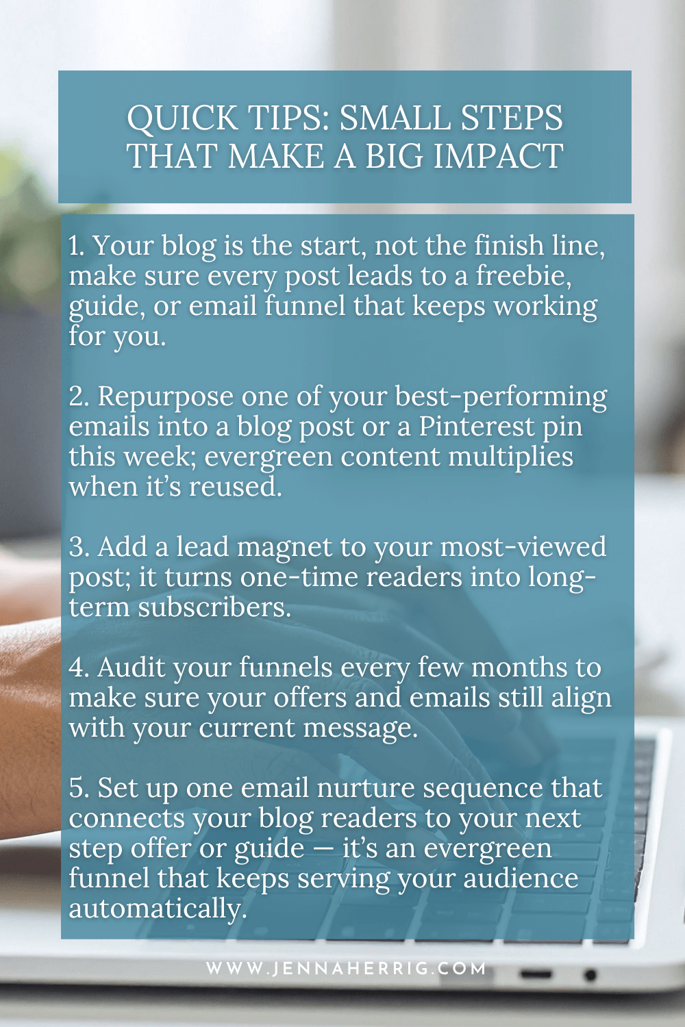 Evergreen content doesn’t stop at your blog - it extends into your lead magnets and funnels. Think of your free guides, email sequences, and low-ticket offers as part of your long-term system. When set up intentionally, they nurture your audience and guide them toward your paid offers, all while staying true to your mission and message.