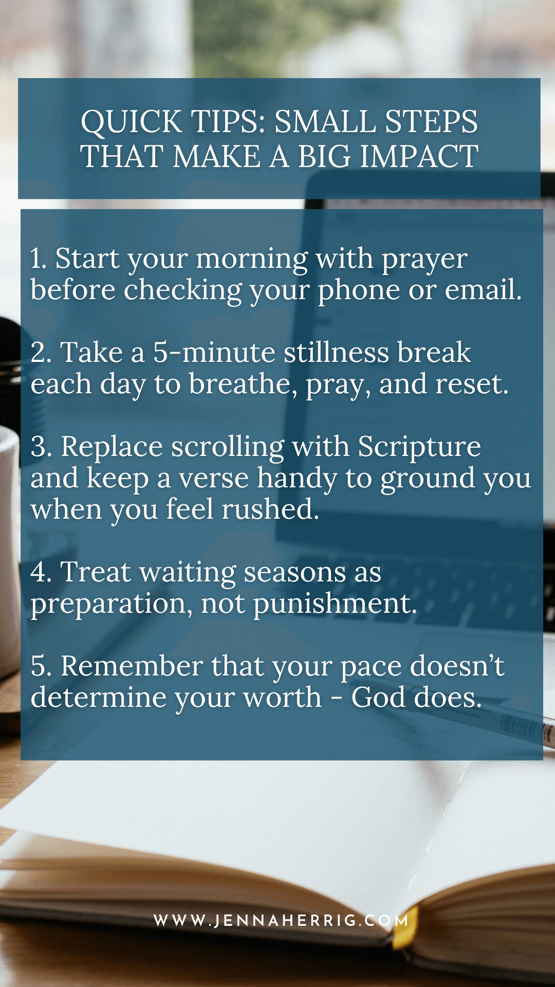 Being still doesn’t mean we stop working or give up on what God has called us to. It means we pause to remember who’s really in control. It’s choosing to rest in His presence, invite Him into the details, and trust that His pace is better than ours.