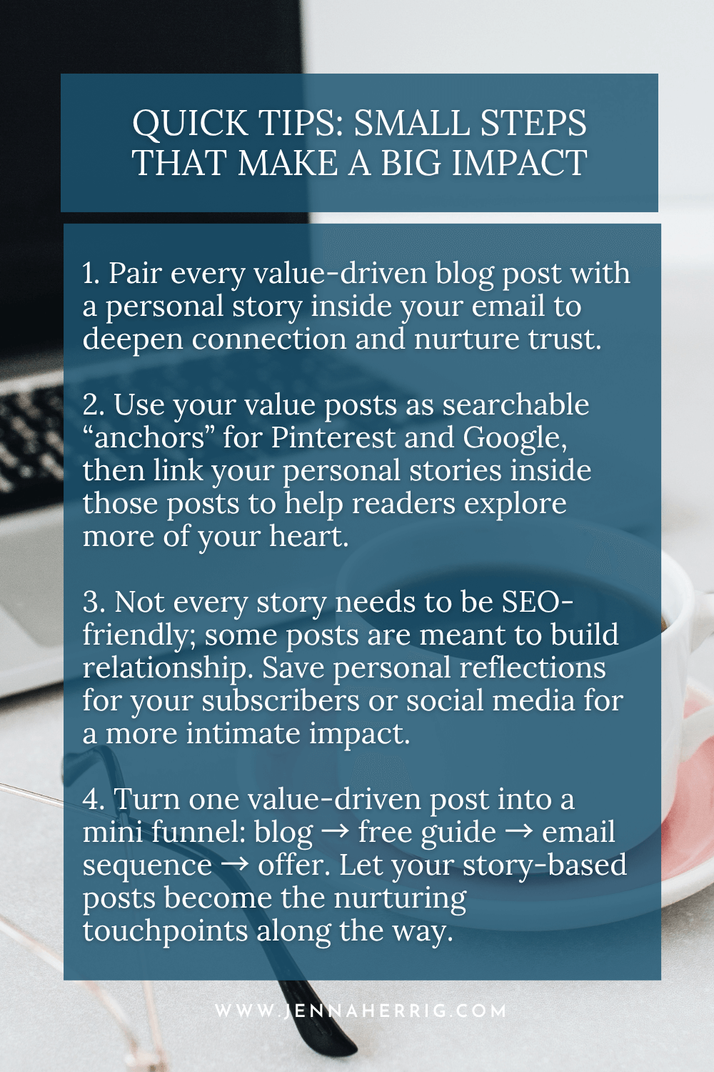 You don’t need to turn every personal story into a Pinterest pin or make it carry the weight of SEO. These heart-centered posts actually make the biggest impact when you use them intentionally, in the places where connection matters most.