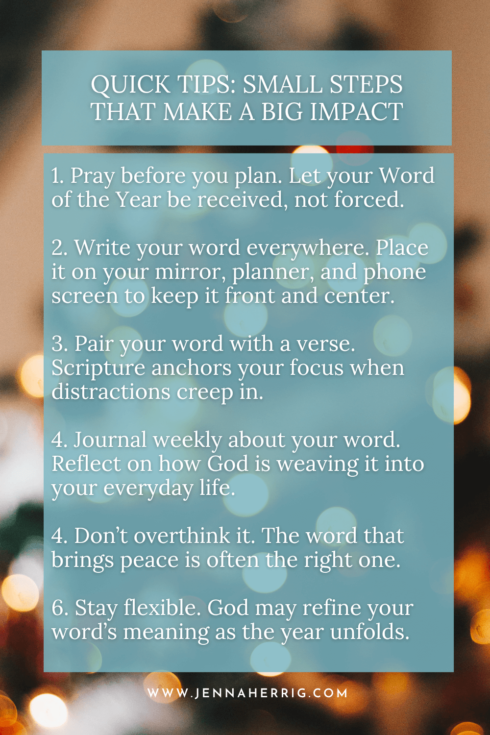 The best way to know your word aligns with God’s will is to confirm it with His Word. Search for Scriptures that connect with your chosen word. If your word is peace, you might meditate on Philippians 4:6–7. If it’s faithfulness, reflect on Galatians 6:9. Write those verses in your journal and pray over them. Ask God to give you confirmation and peace before committing to your word.