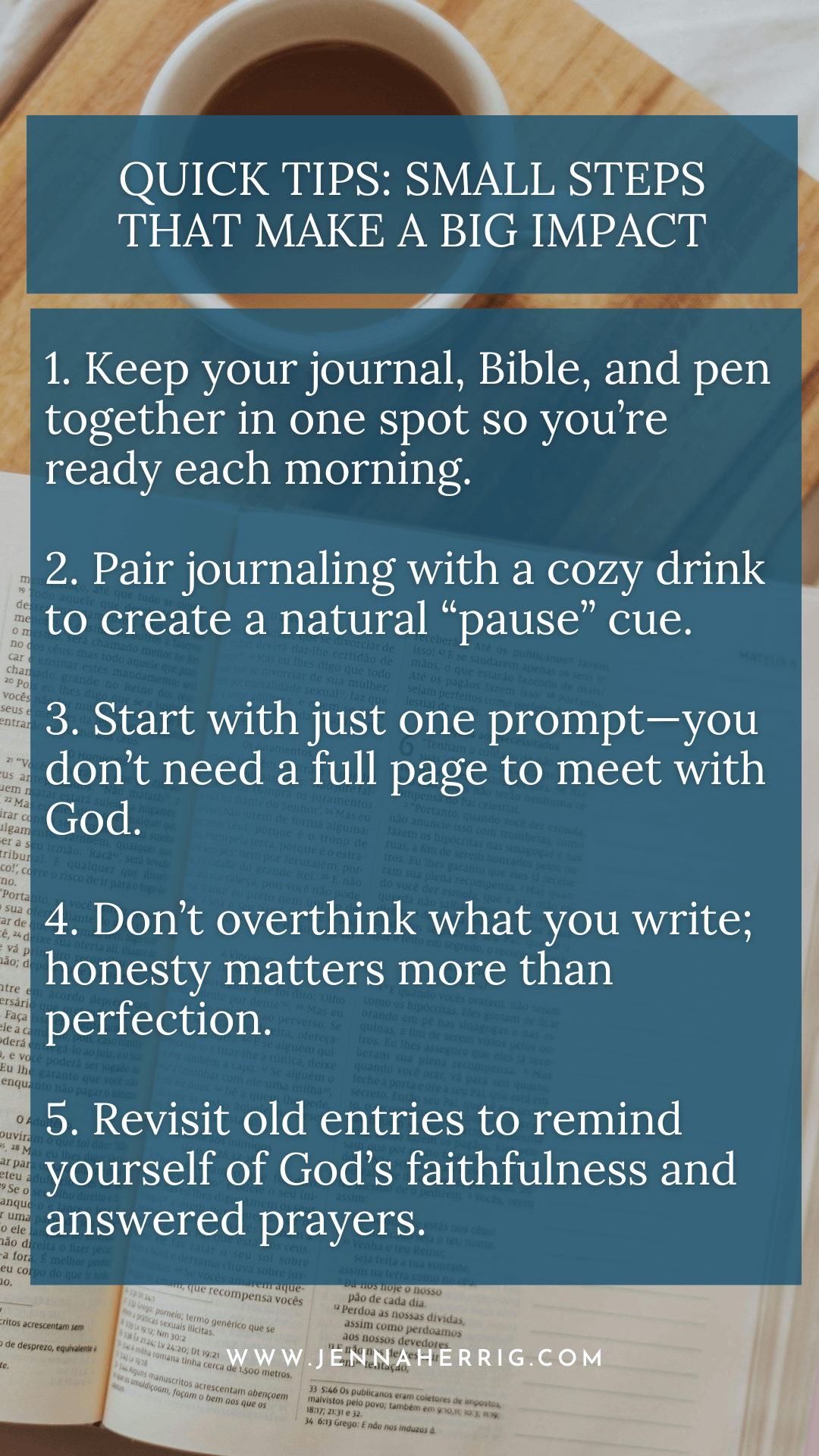 - Pair your journaling with another habit (like drinking tea or reading your Bible)