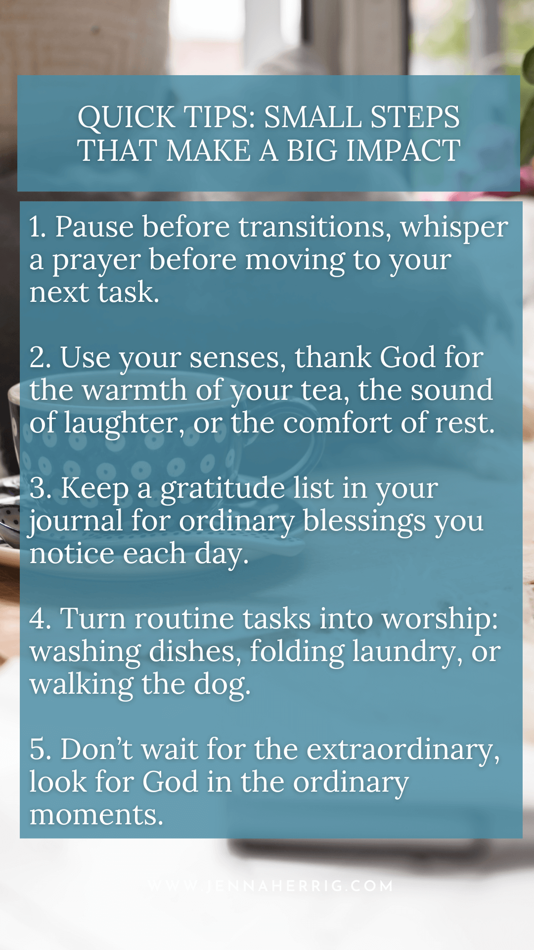 - Use your senses. When you sip your tea, feel the warmth and thank God for His comfort. When you hear laughter, thank Him for joy. When you feel tired, ask Him for strength.
