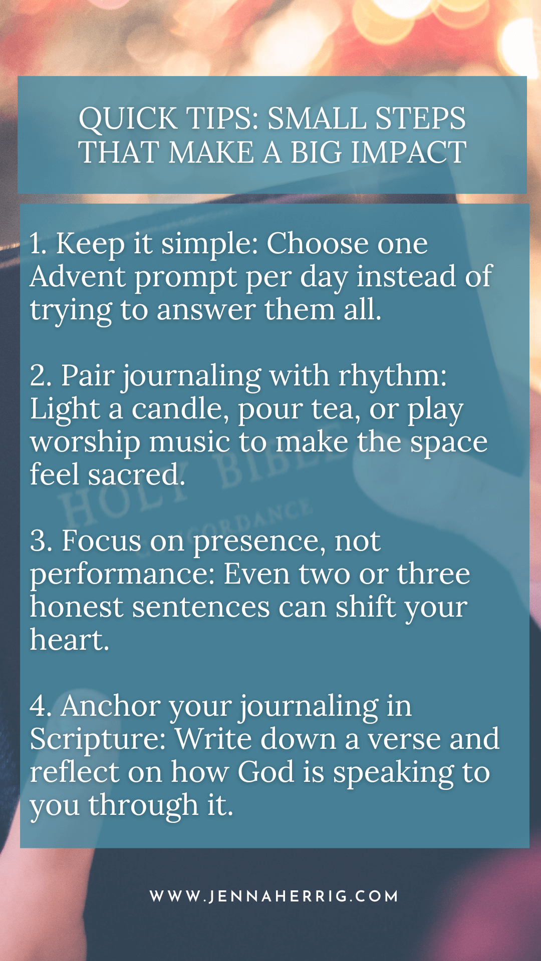 The beauty of Advent journaling is that it doesn’t need to be complicated. Some days you might write a whole page, while other days you might only have time for a few lines. Both are enough. What matters is that you show up with an open heart and create space to meet with Him. Light a candle, pour your favorite tea, or wrap yourself in a cozy blanket, whatever signals to your heart that this moment is sacred. This isn’t about performance; it’s about presence. Even a few honest sentences can shift your perspective and invite peace into your day.