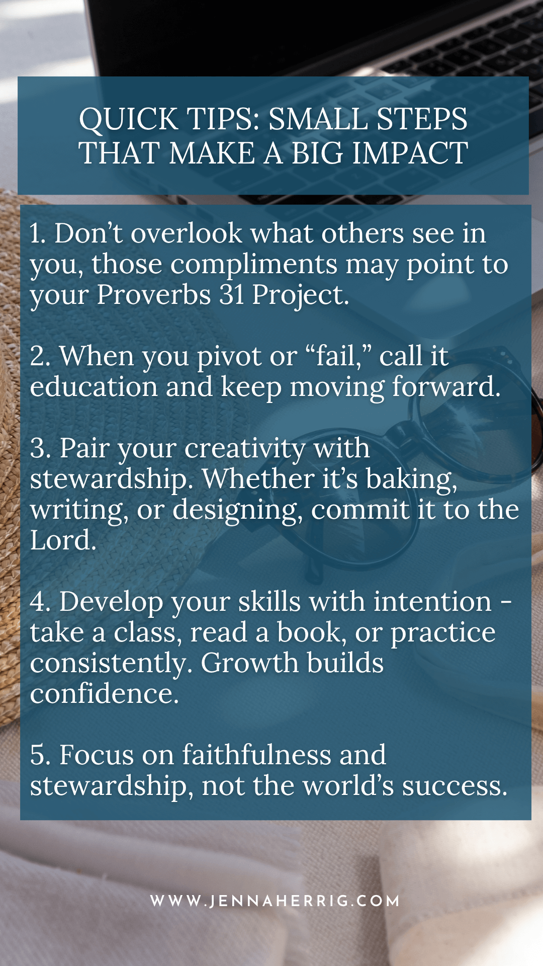 Your Proverbs 31 Project is that beautiful intersection between your gifts, your creativity, and your family’s needs. It’s not about doing everything, but about doing the right things with excellence and a willing heart.